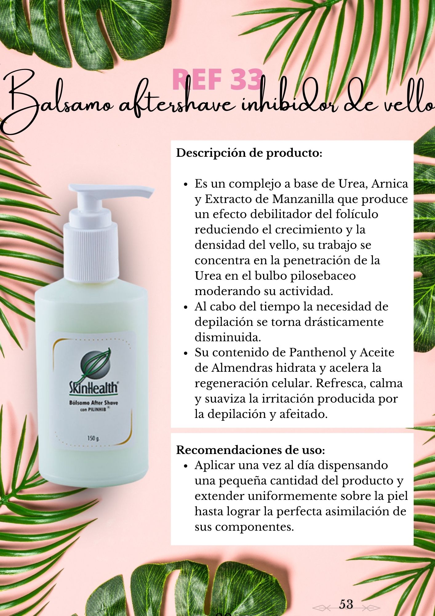 un efecto debilitador del folículoreduciendo el crecimiento y ladensidad del vello, su trabajo seconcentra en la penetración de laUrea en el bulbo pilosebaceomoderando su actividad.Al cabo del tiempo la necesidad dedepilación se torna drásticamentedisminuida.Su contenido de Panthenol y Aceitede Almendras hidrata y acelera laregeneración celular. Refresca, calmay suaviza la irritación producida por la depilación y afeitado.